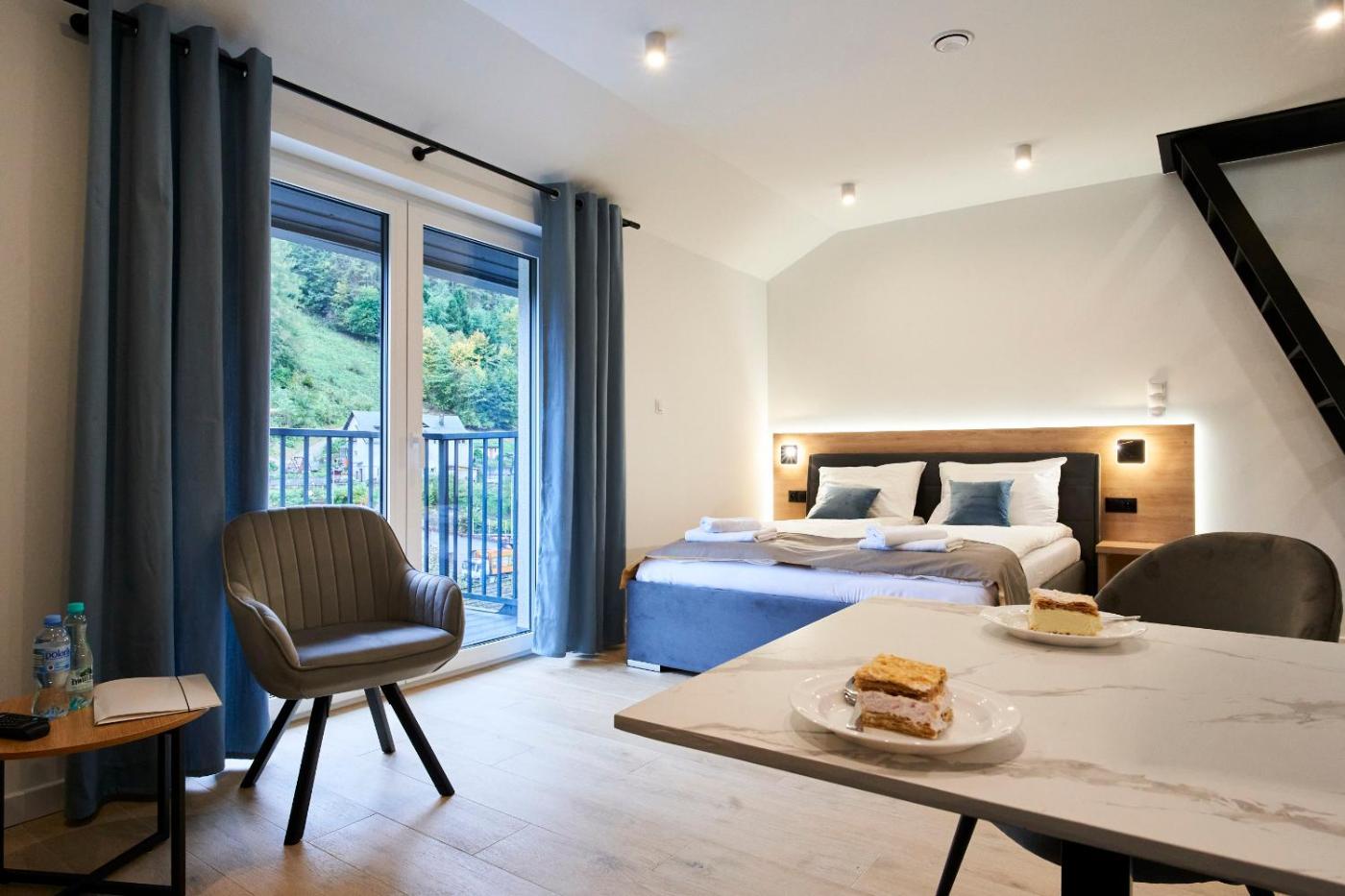 Apartament dwupoziomowy. This apartment consists of a kitchenette, a seating area, 2 bedrooms, 1 of which is a loft, and 1 bathroom with a walk-in shower and a hairdryer. In the well-fitted kitchenette, guests will find a stovetop, a refrigerator, kitchenware and a microwave. Featuring a balcony with garden views, this apartment also provides a tea and coffee maker and a flat-screen TV with streaming services. The unit offers 1 bed and 2 futons. This loft has a low ceiling and no windows. This loft is only accessed via a ladder. Apartament - 4 osobowy. Powierzchnia pokoju ok.: 40 mkw. ;